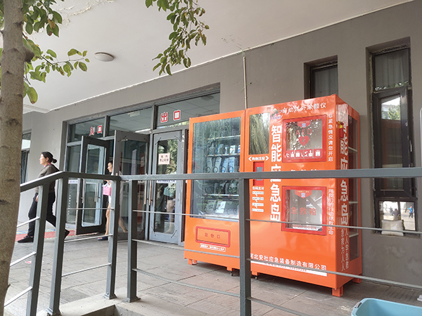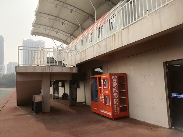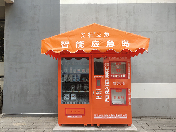 与河北本公司师范大学展开合作投放智能应急岛,其中AED目的是为了预防与抢救心脏病突发患者,(心脏骤停病人早期85%~90%是室颤,治疗室颤最有效的方法是早用AED除颤。除颤每除推迟1分钟,存活率降低7%~10%。CPR与AED在黄金四分钟内有效配合使用,是抢救心跳呼吸骤停猝死病人的最有效抢救手段);急救箱是为了应对各种突发情况如:摔伤划伤等,都可以免费使用急救箱来进行包扎治疗。智能应急岛还带有销售部分,用于满足学生日常消杀(如消毒棉球、碘伏棉棒、创可贴等)。